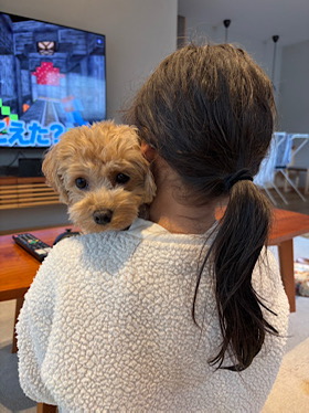 スイミング後の娘とひょっこりムクちゃんです🐶