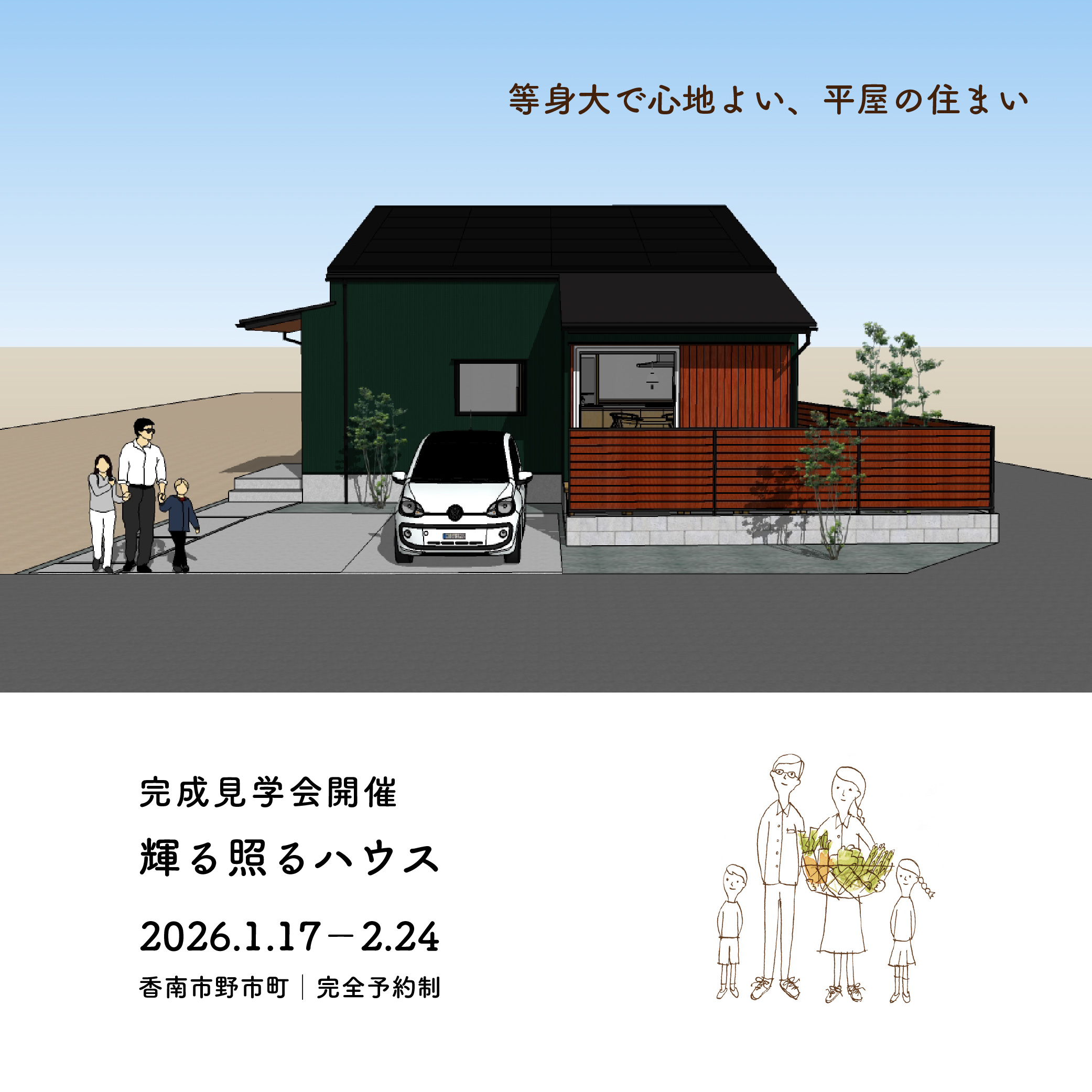 場所 :香南市野市町野市町にて完成見学会を開催します。 「 輝る照るハウス」 南と東に道路が面した日当たりの良い南東角地に建ち、 明るさと開放感のある暮らしを実現していま…
