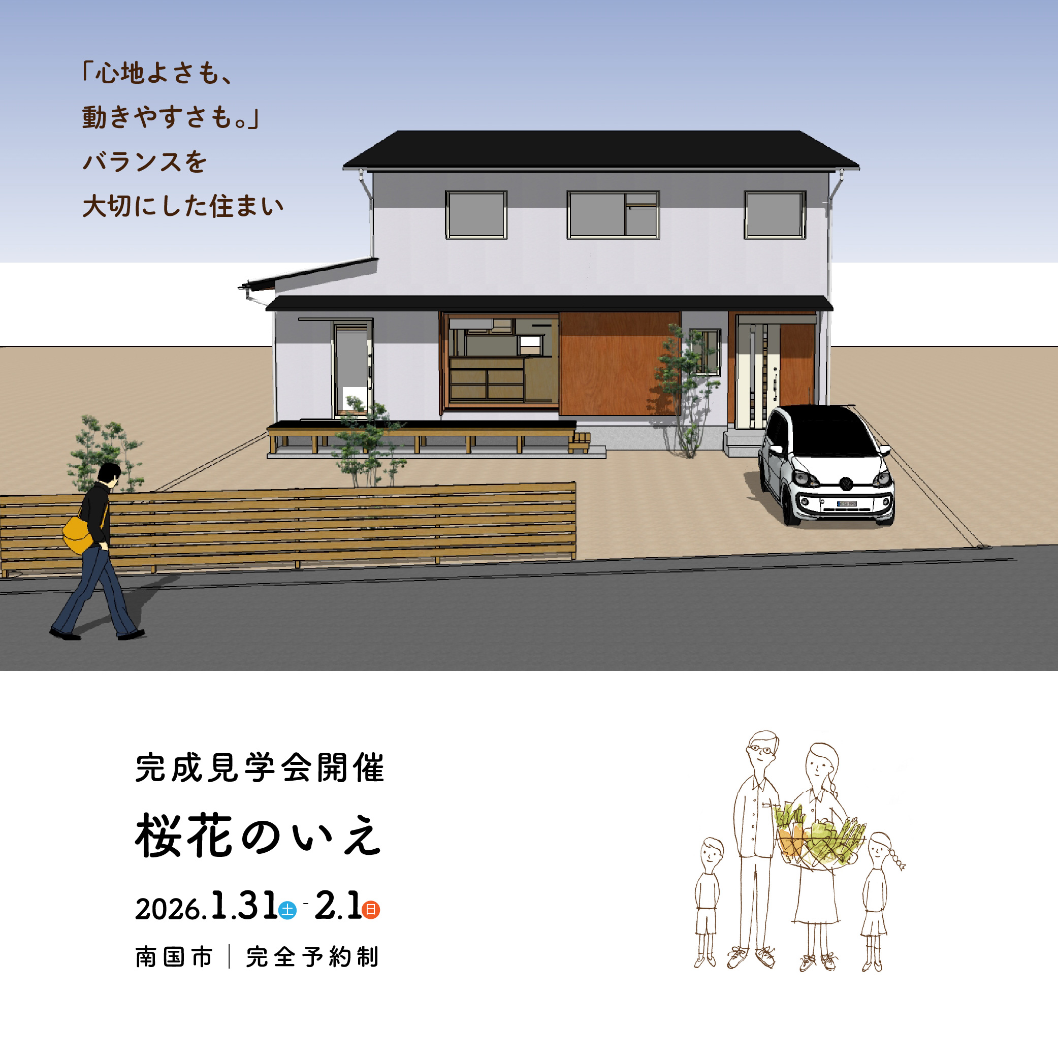 場所 :南国市南国市にて完成見学会を開催します。 和を感じ 心が癒やされる 「 桜花のいえ 」 「心地よさも、動きやすさも。」 LDKの壁には湯布珪藻…