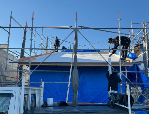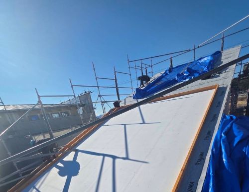 年末に無事上棟を終え、現在は屋根の下地工事、そして内部では耐震用金物の施工が進んでいます。