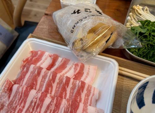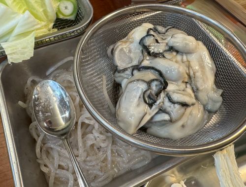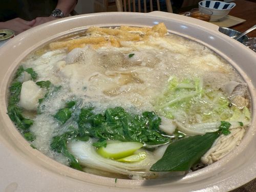 自前で出汁を作って、生タラ、牡蠣、すり身、豆腐、糸コン、エノキ、白菜、ネギ、豚バラ、お麩、春菊、仕上げに山芋を入れて完成。