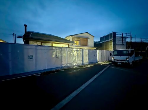 住まいるパークでは工期が迫る中、現場の大工さんたちにお願いして遅くまで残業してもらっています。