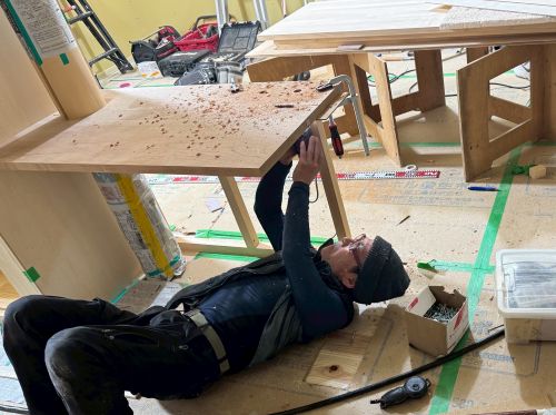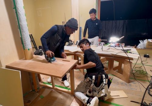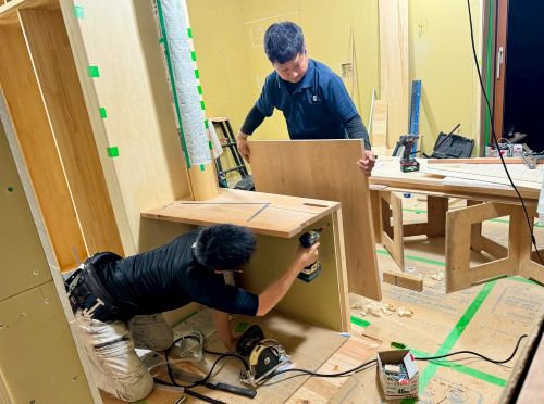時間も遅くなってきた中、ひとつの造り付けデスクを3人がかりで一気に仕上げます。